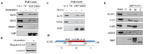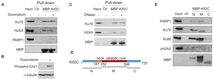 Figure1, supplement 1. Kif2C associates with DNA repair proteins. (A) MBP-Kif2C pull down was performed in HeLa cells with or without doxorubicin (2 μg/mL) treatment. Input, control pulldown with blank beads, and MBP pulldown samples were analyzed by immunoblotting. (B) Doxorubicin treatment, as in panel A, activated DNA damage signaling, as indicated by Chk1 phosphorylation at Ser-317. (C) MBP-Kif2C pull down was performed in HeLa cells as in panel A. Cell lysates were incubated with DNase I (100 units/mL) as indicated. Input, control pulldown with blank beads, and MBP pulldown samples were analyzed by immunoblotting. (D,E) The N, M, C segments of Kif2C, as shown in panel D, were used for pull-down in the lysates of HeLa cells treated with doxorubicin. Control (ctr) pull-down was performed using blank beads. Immunoblots are shown in panel E. |