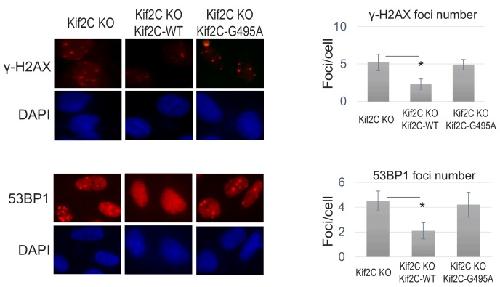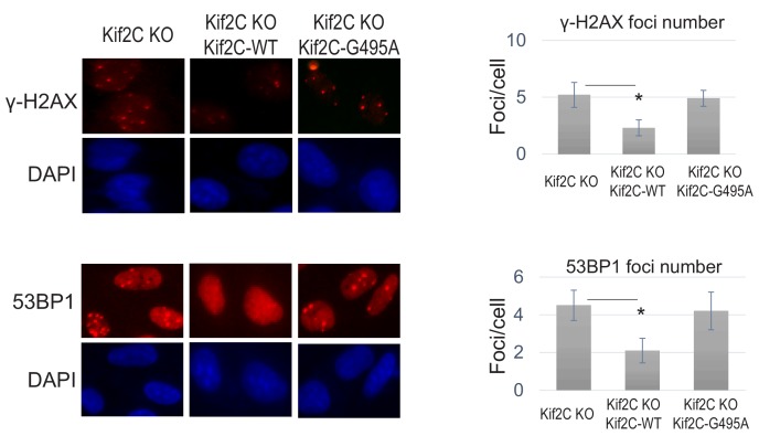 Figure 3, supplement 1. Foci formation of ï§-H2AX and 53BP1 in undamaged Kif2C knockout (KO) cells. Representative foci formation is shown in Kif2C KO cells with or without expression of WT or G495A Kif2C, as in Fig. 3D. Quantifications of foci number are shown on the right panels (N>20). |