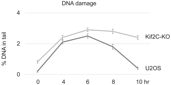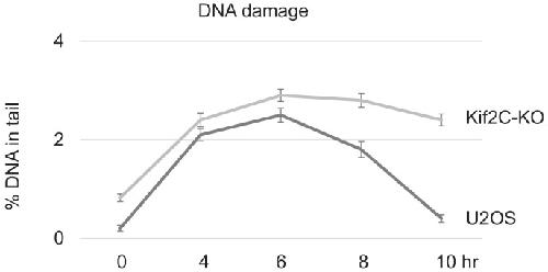 Figure 4, supplement 1. Kif2C depletion impairs DNA repair. Comet assay was performed in U2OS cells with or without Kif2C knockout. The cells were treated with doxorubicin at time 0 for 1 hr. The percentage of DNA in the tail section was quantified, the mean values and standard derivations are shown (N>10). |