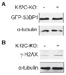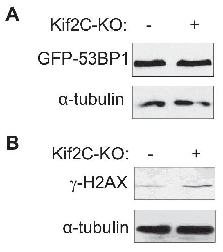 Figure 5, supplement 1. Kif2C depletion did not affect the expression of GFP-53BP1 (A). Kif2C depletion increased g-H2AX induced by etoposide (B) |