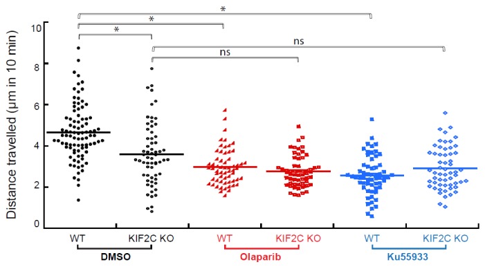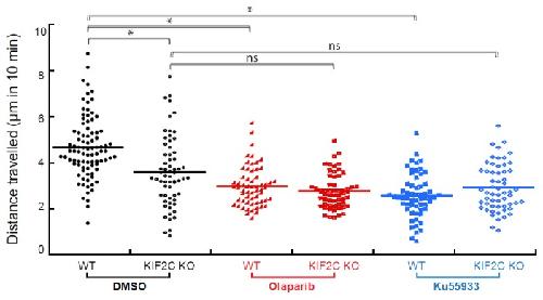 Figure 6—figure supplement 1. ATM and PARP inhibition impairs Kif2C-dependent foci mobility.As shown in Figure 6A and B, Mean-square displacement measurements of EGFP-53BP1 foci were measured in WT and Kif2C KO U2OS cells treated with the vehicle control (DMSO), the PARP1 inhibitor Olaparib (10 μM), or the ATM inhibitor KU55933 (20 μM). Quantification of the distance travelled by EGFP-53BP1 foci over 10 min in the corresponding cells, as in Figure 6, is presented here in three groups (DMSO, Olaparib, and Ku55933). |