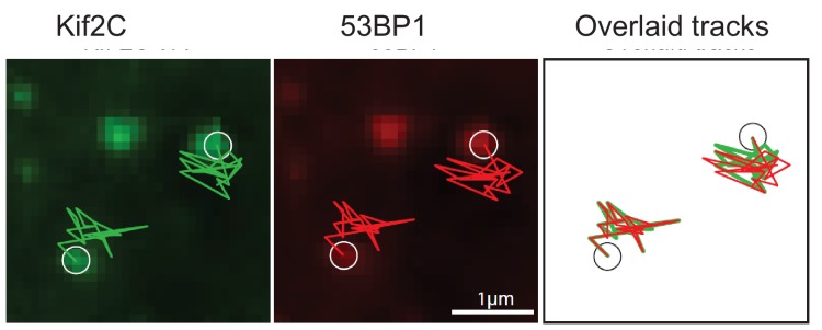 Figure 2, supplement 1. The co-localization and co-migration of Kif2C and 53BP1 foci. Two representative examples of Kif2C and 53BP1 foci were tracked in U2OS cells. The coordinated movements of WT-KIF2C and 53BP1 foci are shown. |