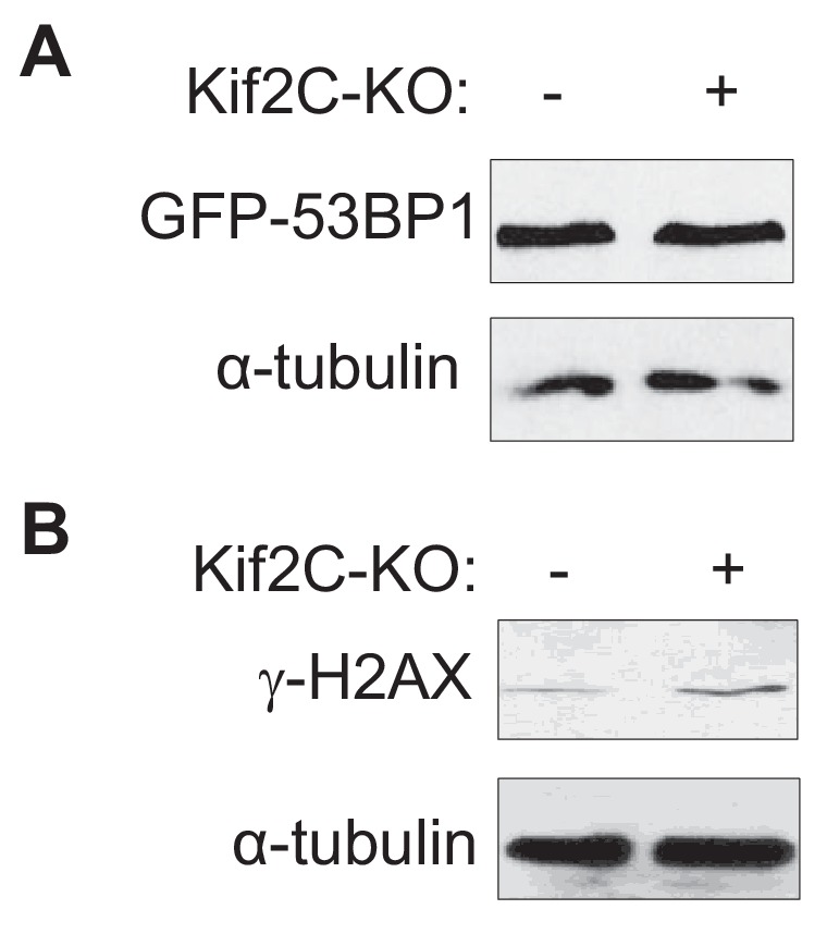 Figure 5—figure supplement 1. Kif2C depletion did not affect the expression of GFP-53BP1 (A).Kif2C depletion increased g-H2AX induced by etoposide (B). |