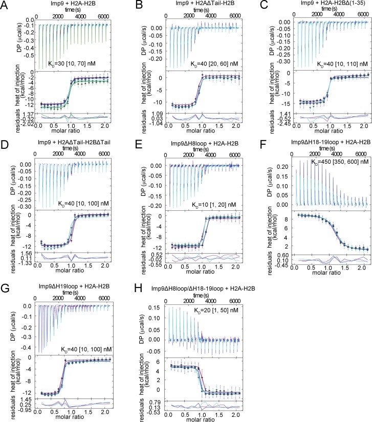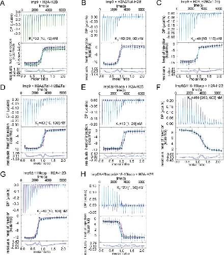 Figure 1—figure supplement 1. ITC analysis of Imp9 binding to H2A-H2B.(A-H) The GUSSI output for global analysis of each experiment (binding proteins mentioned above the panel) carried out in triplicates. The top panel shows the SVD-reconstructed thermogram provided by NITPIC, the middle panel shows the isotherms and the bottom panel shows the residuals. Individual experiments in the triplicate sets are differently color-coded. DP - differential power. |