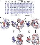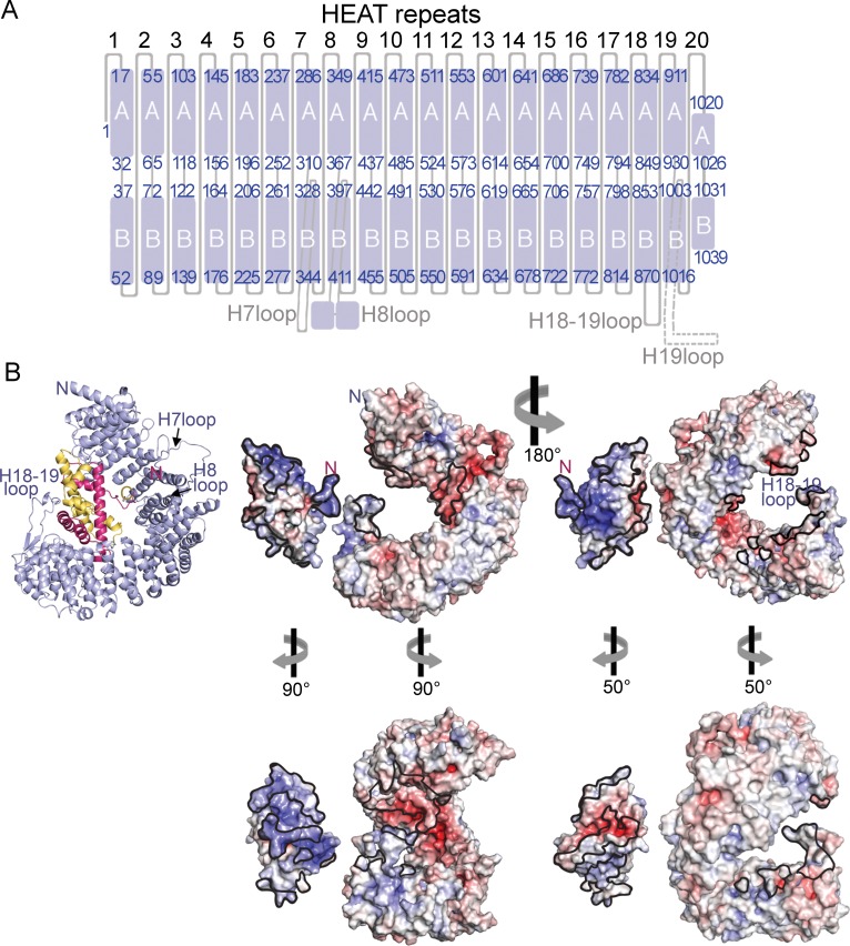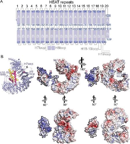 Figure 1âfigure supplement 2. HEAT repeat organization of Imp9 and electrostatic surface potential of Imp9 and H2A-H2B.(A) Organization of the 20 HEAT repeats of Imp9. The H19loop, which is not modeled, is shown with a dashed line. (B) Structure of the Imp9â¢H2A-H2B complex shown in cartoon representation, for comparison with the surface representations. Two views (180° rotation about the vertical axis) of the electrostatic surface potential (from â8 kV to +8 kV) of H2A-H2B and Imp9. The left view is the same as the cartoon representation, with the two proteins separated for viewing of the surfaces. The structures in the panel below show approximate open-book views. Interfaces on Imp9 and H2A-H2B are outlined in black. The electrostatic surface was generated in PyMol using APBS plugin (Baker et al., 2001). |