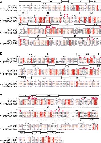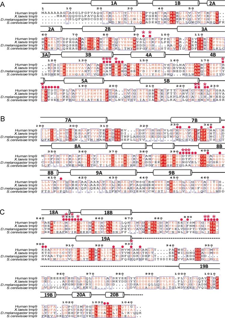 Figure 2âfigure supplement 3. Sequence alignment of regions of Imp9 that interact with H2A-H2B.(A-C) Sequence alignment of Imp9 sequences (human, X. laevis, D. melanogaster and S. cerevisiae) from the region that forms Interface 1 (A), Interface 2 (B) and Interface 3 (C) in Imp9â¢H2A-H2B structure. Residues in the three interfaces are mostly conserved, with Interface three being the most conserved. The level of conservation is consistent with many Imp9 residues, especially in Interface 1, using their main chain for interactions with histone residues. |