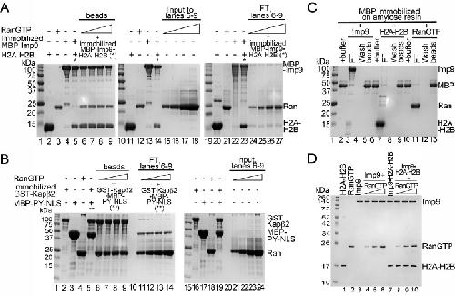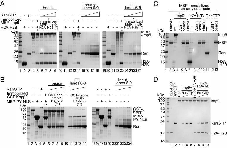 Figure 4—figure supplement 1. Interactions between RanGTP and the Imp9•H2A-H2B complex.(A) Pull-down binding assays to probe RanGTP (S. cerevisiae Gsp1 (1–179/Q71L) interactions with the Imp9•H2A-H2B complex. Increasing concentrations of RanGTP (12.5 μM, 25 μM, 50 μM or 75 μM) was added to 2.5 μM MBP-Imp9•H2A-H2B. After washing, bound proteins were visualized by Coomassie-stained SDS-PAGE. 2% of input RanGTP for the corresponding to binding reactions in lanes 6–9 are shown lanes 15–18. 2% of the flow-through from the corresponding to binding reactions in lanes 6–9 are shown lanes 24–27. (B) Pull-down binding assays to probe RanGTP mediated dissociation of MBP-PYNLS from the GST-Kapβ2•MBP-PY-NLS complex. Increasing concentrations of RanGTP (12.5 μM, 25 μM, 50 μM or 75 μM) was added to 2.5 μM GST-Kapβ2•MBP-PY-NLS. After washing, the bound proteins were visualized by Coomassie-stained SDS-PAGE. 2% of input RanGTP for the corresponding binding reactions in lane 6–9 are shown in lanes 21–24. 2% of flow-through from the corresponding binding reactions in lanes 6–9 are shown in lanes 11–14. (C) Controls for pull-down binding assays. Imp9 (lanes 3–5), H2A-H2B (lane 7–9) or RanGTP (lane 11–13) was added to immobilized MBP. The flow-through (FT), the last wash and the proteins that remain bound on beads after washing were visualized by Coomassie-stained SDS-PAGE. (D) Coomassie-stained SDS-PAGE of the protein inputs for the native gel in Figure 4E. |