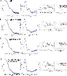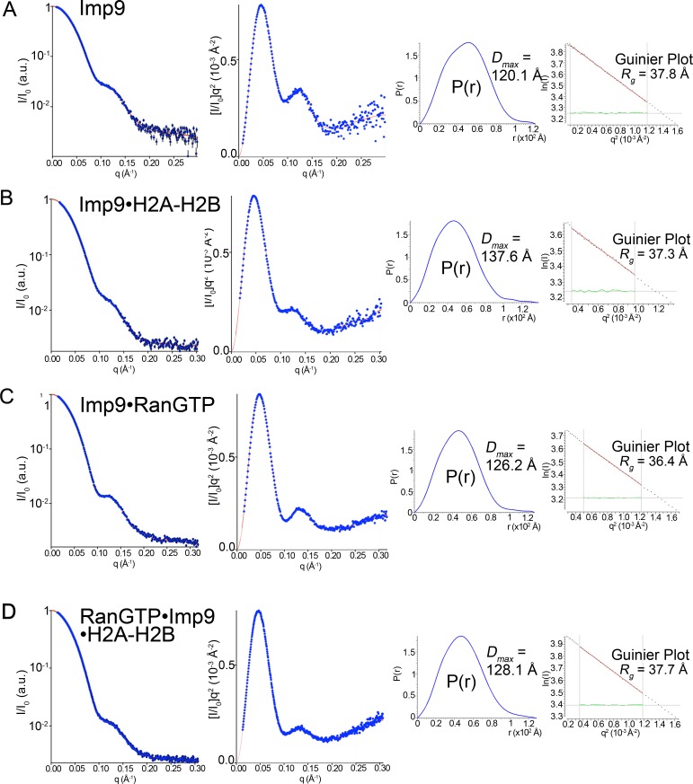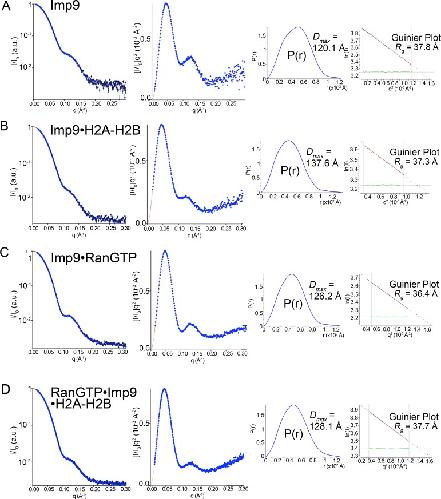 Figure 4âfigure supplement 3. SAXS analysis of Imp9, Imp9â¢RanGTP, Imp9â¢H2A-H2B, and RanGTPâ¢Imp9â¢H2A-H2B.(A-D) Experimental SAXS profiles of Imp9 (A), Imp9â¢H2A-H2B (B), Imp9â¢RanGTP (C), and RanGTPâ¢Imp9â¢H2A-H2B (D) were used to compute radius of gyration (Rg), maximum particle size (Dmax), pair distribution function (P(r)) and estimated molecular weights (Figure 4G and Figure 4âsource datas 1 and 2). Left panels: experimental SAXS profile (blue dots with black error bars) is shown along with the extrapolation curve (red). The corresponding Kratky plot, used to depict the level of flexibility, is also shown in blue dots along with the extrapolation curve (red). Right panels: The left plot shows the pair distribution function, P(r). The maximum particle size (Dmax) was determined as the maximum pair distance in the plot. The right plot shows the corresponding Guinier plot with the calculated Rg fit value in à . The linearity of the Guinier plots confirms a high degree of homogeneity for each of the SAXS samples. |
