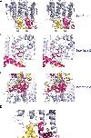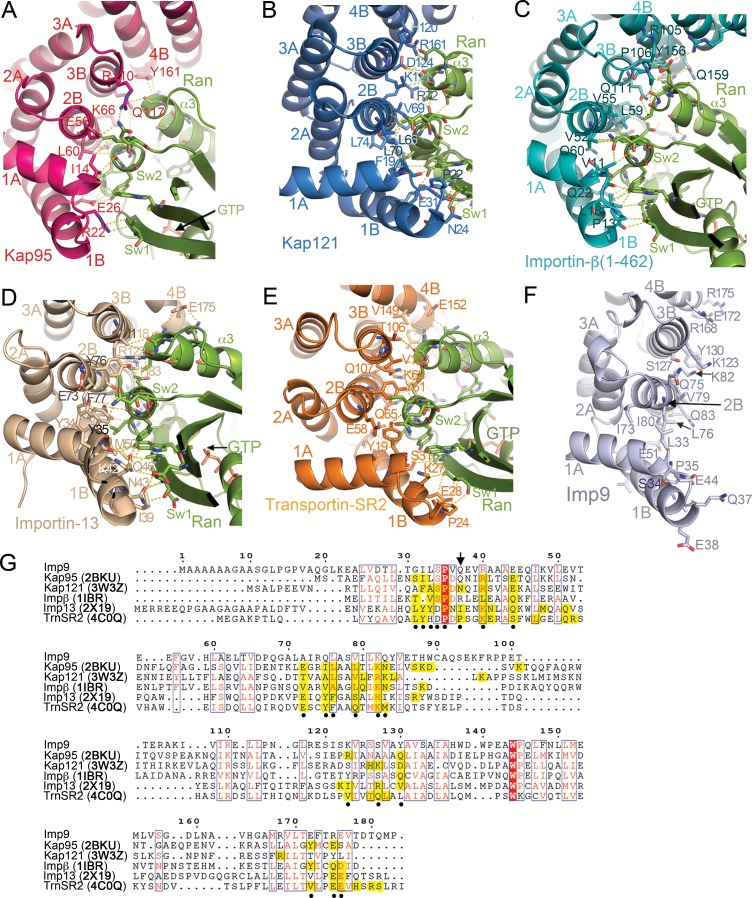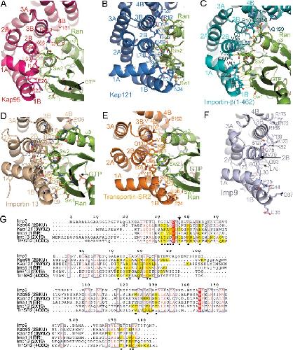 Figure 4âfigure supplement 5. RanGTP binding interfaces at HEAT repeats 1â4 of Kap95, Kap121, Importin-β, Importin-13 and Transportin-SR2.(A-E) RanGTP binding interfaces- at the N-termini of the importins: Kap95â¢RanGTP (A); 2BKU), Kap121â¢RanGTP (B); 3W3Z), Importin-β(1-462)â¢RanGTP (C; 1IBR), Importin-13â¢RanGTP (D); 2 à 19) and Transportin-SR2⢠RanGTP (E); 4C0Q). Interactions are shown with dashed lines and all structures are shown in similar orientations. (F) HEAT repeats 1â4 of Imp9, oriented similarly as importins in AâE), showing side chains on the B helices may contact RanGTP. (G) Sequence alignment of residues in HEAT repeats 1â4 of Imp9, Kap95, Kap121, Importin-β, Importin-13 and Transportin-SR2. Importin positions with identical amino acids are shaded red, and those with conserved amino acids are shown in boxes. There are 18â23 residues/positions in each importin that contact Ran, and they are shaded yellow. Of these, 20 positions contact Ran in â¥3 importins (marked with black circles). The majority of Ran contacts in each of the five importins are among these 20 most commonly used positions but only 8 of the 20 most common Ran contact positions show sequence conservation (marked with black circles and boxed). Flexibility of the HEAT repeat architecture and diversity of importin-Ran interactions at any site within the interface results in structural conservation at the interface between the N-termini of importins and the switch 1, 2 regions of RanGTP even when sequence conservation is not high. For example, the position of Q37 (marked with arrow) in Imp9 is not conserved in sequence but the side chains in Kap121, Importin-13 and Transportin-SR2 (all at the N-terminal end of the B helix of HEAT repeat 1) interact with the N-terminal end of the β2 strand of Ran (part of switch 1). Pro24 of Transportin-SR2 and Ile39 of Importin-13 make hydrophobic interactions with a Val47 side chain of Ran, but Asn24 of Kap121 make polar contacts with the main chain of Ran Val47. The majority of Imp9 side chains in the most common/structurally conserved Ran contact sites (marked with black circles) are the same as or have similar chemical characteristics as at least one of the five other importin side chains in that same position, supporting the prediction that RanGTP will likely contact Imp9 at the same location as shown in AâE), on the B-helices of HEAT repeats 1â4. |