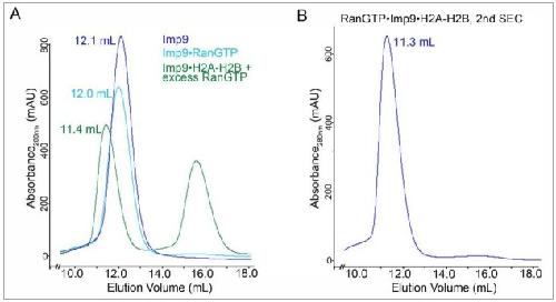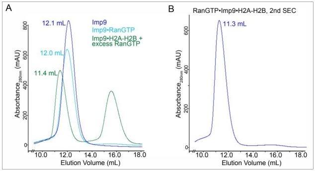 Author response image 1. SEC for SAXS sample prepation.A. SEC profiles of 1) Imp9 alone (blue trace), 2) a previously purified Imp9â¢RanGTP complex (light blue trace) and 3) a previously purified Imp9â¢H2A-H2B + excess RanGTP (green; the peak at ~ 16 ml is excess RanGTP). Elution volume for each of the Imp9-containing peaks is listed. B. Fractions for the Imp9 containing peak in the SEC of Imp9â¢H2A-H2B + excess RanGTP (green trace in A) were pooled and subjected to a second round of SEC to produce the SAXS sample for the heterotetrameric complex. |