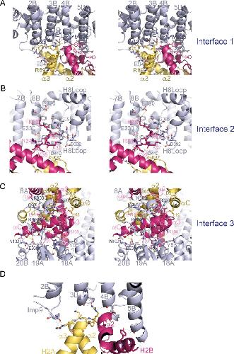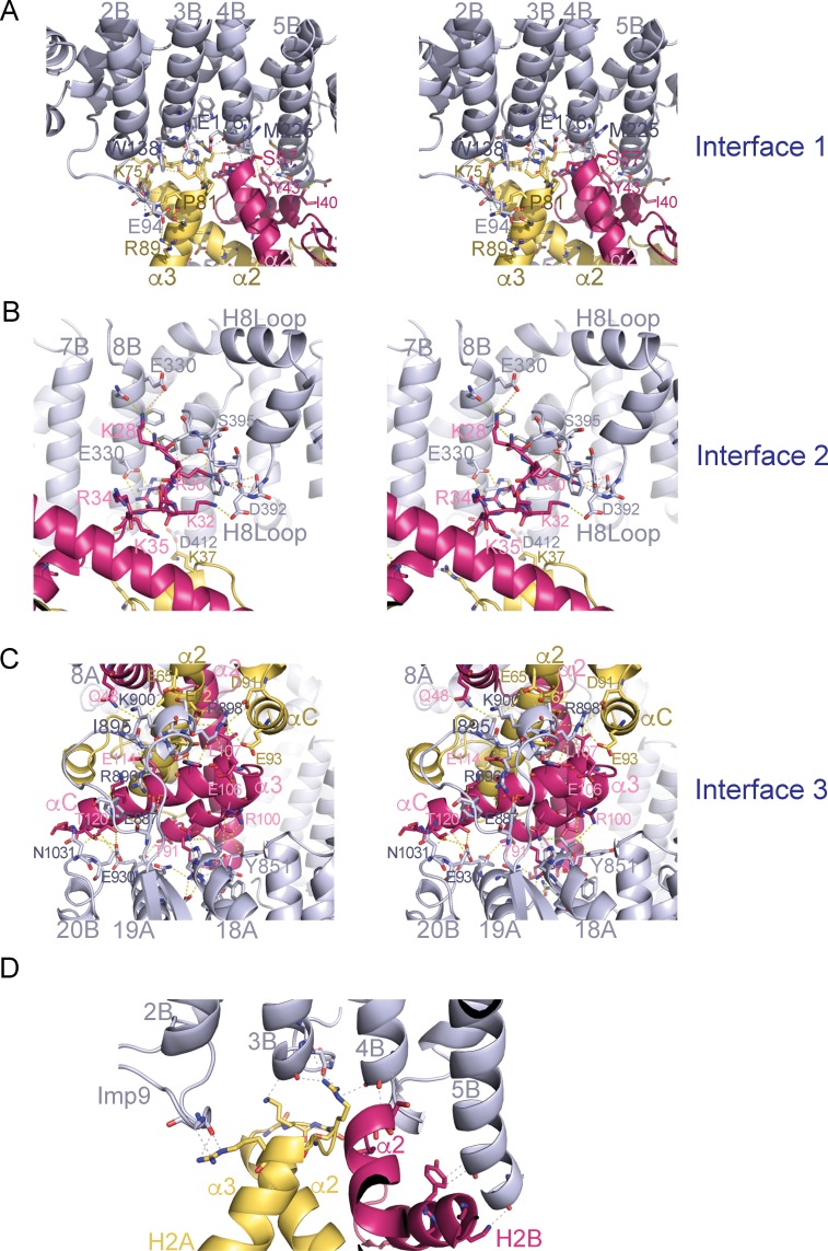Figure 2—figure supplement 1. Stereo views of the Imp9•H2A-H2B interfaces.(A-C) Cross-eyed stereo view of Interface 1 (A), Interface 2 (B) and Interface 3 (C). (D) Interactions between the main chain of Imp9 and H2A-H2B. Interactions between Imp9 (blue) and the histones (H2A is yellow and H2B is red) are shown with dashed lines. |