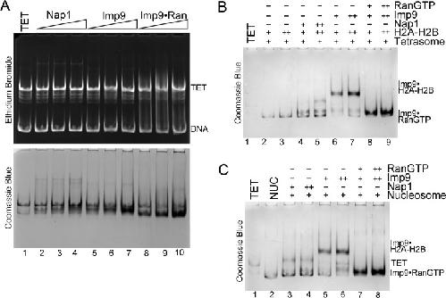 Figure 5—figure supplement 1. RanGTP modulates Imp9-histones interaction for H2A-H2B deposition.(A) Controls for nucleosome assembly assay where either Nap1, Imp9 or Imp9•RanGTP is titrated in molar equivalents of 0.25, 0.5 and 0.75 to tetrasome (TET; 2.5 µM). These proteins do not alter the tetrasome. (B) Nucleosome assembly assay where either H2A-H2B, Nap1•H2A-H2B, Imp9•H2A-H2B or RanGTP•Imp9•H2A-H2B is titrated in molar equivalents of 0.5 and 0.75 to tetrasome (TET; 2.5 µM). Nap1 and Imp9•RanGTP can form nucleosomes (NUC) while Imp9 cannot. Gels are Coomassie stained (ethidium bromide stained gels are shown in Figure 5E). (C) Nucleosome disassembly assay where either Nap1, Imp9 or Imp9•RanGTP is titrated in molar equivalents of 0.5 and 0.75 to constant nucleosome (NUC; 2.5 µM). Imp9 can disassemble nucleosomes to tetrasomes while Nap1 and Imp9-RanGTP cannot. Gels are Coomassie stained (ethidium bromide stained gels are shown in Figure 5F). |