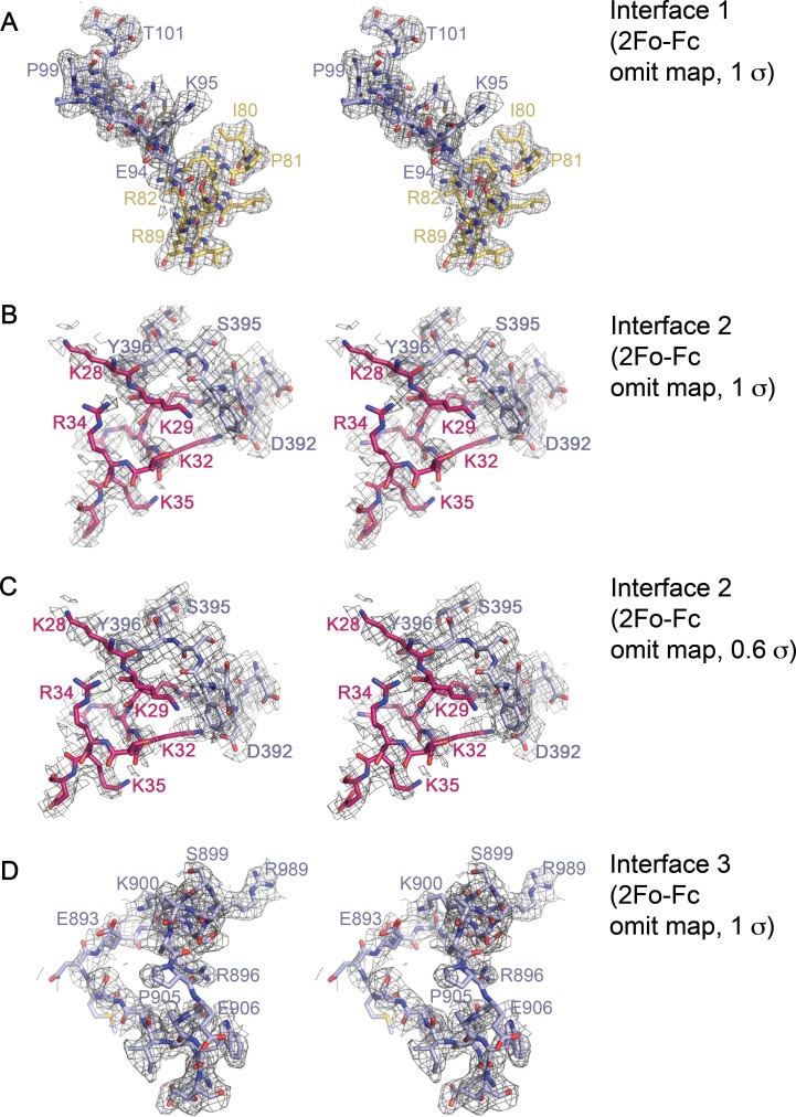 Figure 2âfigure supplement 2. Stereo views of representative electron-density within the Imp9â¢H2A-H2B interfaces.(A-D) Cross-eyed stereo views of representative 2Fo-Fc omit map electron density within Interface 1 (contoured at 1Ï A); residues 90â102 of Imp9 and residues 80â89 of H2B omitted), Interface 2 (contoured at 1Ï in B), and contoured at 0.6Ï in C); residues 390-397of Imp9 and residues 28â36 of H2B omitted) and Interface 3 (contoured at 1Ï D); residues 886â909 on Imp9 omitted). |