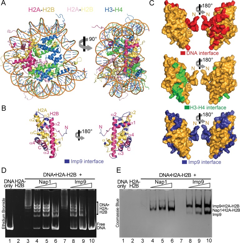 Figure 3. Imp9 has structural and biochemical characteristics of a histone chaperone.(A) Structure of the nucleosome (1AOI): the orientation on the right shows one of the H2A-H2B dimers (in red and yellow) in the same orientation as H2A-H2B shown in the right panel of B. (B) Imp9-bound H2A-H2B (Imp9 not shown) with its Imp9 interface in dark blue. Orientation of H2A-H2B on the left is the same as in Figures 1C and 2A. (C) Surface representations of the H2A-H2B dimer surface (same orientation as in B) showing nucleosomal DNA (red), nucleosomal H3-H4 (green) and Imp9 (blue) binding interfaces. (D-E) Gel-shift assays to probe chaperone activity of Imp9. Increasing concentrations of Imp9 or Nap1 (0.5, 1.0 and 1.5 molar equivalents of H2A-H2B) were added to pre-formed DNAâ¢H2A-H2B complexes, and the mixtures separated on a native gel stained with ethidium bromide to visualize DNA (D) and with Coomassie Blue to visualize protein (E). The two images of the same gel are horizontally aligned. The histone chaperone Nap1 binds H2A-H2B (E, lanes 4â6) leading to the release of free DNA (D, lanes 4â6). Imp9 also releases free DNA (D, lanes 8â10) as it binds H2A-H2B (E, lanes 8â10). |
