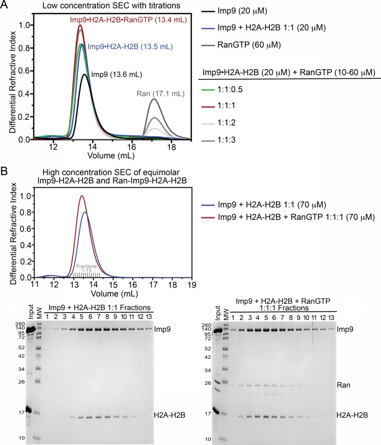 Figure 4âfigure supplement 2. Size exclusion chromatography of Imp9, H2A-H2B and RanGTP complexes.(A) Size exclusion chromatography (SEC) of 20 μM Imp9 alone (black), 60 μM RanGTP alone (dark grey), Imp9 +H2A-H2B 1:1 (20 μM; blue), and Imp9 +H2A-H2B 1:1 (20 μM) with Ran at 0.5 (10 μM; green), 1 (20 μM; red), 2 (40 μM; light grey) or 3 (60 μM; grey). The buffer was 20 mM HEPES pH 7.4, 200 mM sodium chloride, 2 mM magnesium acetate, 2 mM TCEP and 8% (v/v) glycerol. Column was Superdex S200 Increase 10/300. Imp9 alone elutes at 13.6 mL, while the 1:1 Imp9â¢H2A-H2B complex elutes at 13.5 mL. We see the formation of a 1:1:1 RanGTPâ¢Imp9â¢H2A-H2B complex. Addition of an equimolar amount of RanGTP causes the Imp9â¢H2A-H2B peak to shift from 13.5 mL to 13.4 mL. Continued addition of RanGTP beyond a 1:1:1 mixture, results in the appearance of free RanGTP that elutes at 17.1 mL. Comparison to a Ran only control (60 μM; dark grey) shows that the Imp9â¢H2A-H2Bâ¢Ran complex has a 1:1:1 stoichiometry. Quantitatively, the free RanGTP peak is absent in the 1:1:1 sample, is one-third of the control in a 1:1:2 sample, and two-thirds of the control in a 1:1:3 sample. (B) SEC of 1:1 Imp9 +H2A-H2B (70 μM; blue) and 1:1:1 Imp9, H2A-H2B, and Ran (70 μM; red). The buffer was 20 mM HEPES pH 7.4, 200 mM NaCl, 2 mM magnesium acetate, 2 mM TCEP and 8% (v/v) glycerol. Column was Superdex S200 Increase 10/300. Peak fractions (Fractions 1â13) were analyzed on 15% SDS-PAGE stained with Coomassie blue. As in A), Imp9â¢H2A-H2B elutes at 13.5 mL and the peak eluting at 13.4 mL contains 1:1:1 RanGTPâ¢Imp9â¢H2A-H2B. Analysis of peak fractions by SDS-PAGE shows the presence of Imp9, H2A-H2B, and Ran in the peak. Each protein stains in proportion to that seen in the input lane, consistent with the formation of a 1:1:1 complex. Also, in the SEC there is no free H2A-H2B or free Ran. |