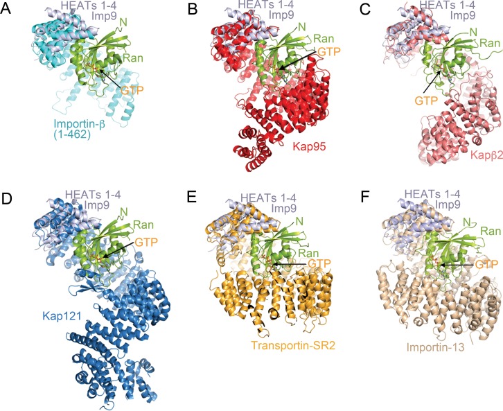 Figure 4âfigure supplement 4. Comparative structural analysis of importin-RanGTP complexes.(A-F) Structural alignment of HEAT repeats 1â4 of six different importin-RanGTP complexes to HEAT repeats 1â4 of Imp9. The complexes compared are Importin-β(1-462)â¢RanGTP (A; 1IBR), Kap95â¢RanGTP (B); 2BKU), Kapβ2â¢RanGTP (C); 1QBK), Kap121â¢RanGTP (D); 3W3Z), Transportin-SR2⢠RanGTP (E); 4C0Q) and Importin-13â¢RanGTP (F); 2 à 19). The importins are shown with different colors, Ran in green and the aligned N-terminal HEAT repeats of Imp9 are in light blue. All structures are shown with the same orientation of the aligned Imp9 (HEAT repeats 1â4). Ran is oriented very similarly and binds at very similar locations, at the B helices of HEAT repeats 1â4 of the importins, in all six structures. The pitches of the importin superhelices are different, resulting in the second importin-Ran interface (located at the bottom of Ran in AâF) interacting with different central or C-terminal HEAT repeats of the importins. |