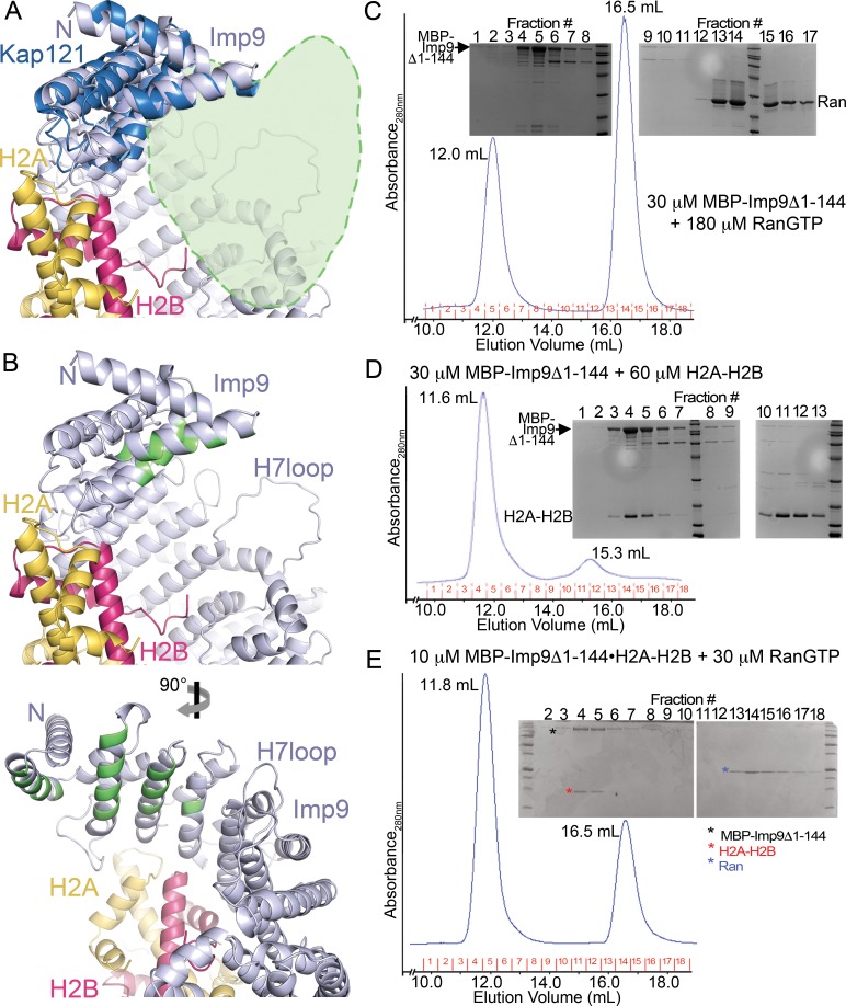 Figure 4âfigure supplement 6. The predicted RanGTP binding site at HEAT repeats 1â4 of Imp9.(A) A zoomed in view (the N-terminal half of Imp9) of the Imp9â¢H2A-H2B structure shown in the same orientation as the importins in Figure 4âfigure supplement 5D. Imp9 is in blue, H2A in yellow and H2B in red. Imp9 is structurally aligned with the 1st four HEAT repeats of Kap121 (shown in dark blue) in the Kap121â¢RanGTP structure (3W3Z). RanGTP from the Kap121â¢RanGTP structure is not shown but is schematically depicted by the light-green heart-shape drawing to mark the predicted location of the Ran site on Imp9. (B) Top panel, same view of the Imp9â¢H2A-H2B structure as in A), with Imp9 residues at the predicted RanGTP binding site colored green. Bottom panel shows the view upon 90° rotation about the vertical axis.( CâE) Size exclusion chromatography of MBP-Imp9Î1â144 + excess RanGTP (C), MBP-Imp9Î1â144 + H2A-H2B (D) and previously purified MBP-Imp9Î1â144â¢H2A-H2B + excess RanGTP (E). 500 μL protein samples were loaded on to a Superdex S200 Increase 10/300 column and the size exclusion chromatography experiments were performed in buffer containing 20 mM HEPES pH 7.4, 200 mM sodium chloride, 2 mM magnesium acetate, 2 mM DTT and 10% glycerol. The elution volume for each protein peak is shown and proteins in the fractions are visualized by Coomassie-stained SDS-PAGE gels shown above the chromatograms. SEC analysis shows that RanGTP does not interact with the Imp9 mutant. No interaction is seen at micromolar concentrations even when RanGTP is added at a 6-fold molar excess. This is obvious from the SDS-PAGE analysis of SEC fractions, showing that the Imp9 mutant and RanGTP do not co-migrate (C). The Imp9 mutant protein is functional as the interaction is maintained with H2A-H2B (D). This is consistent with the crystal structure showing that the region spanning HEAT repeats 1â3 of Imp9 (residues 1â144) is only a very small portion of the very large Imp9â¢H2A-H2B interface. Not surprisingly, like Imp9 mutant alone in C), the histone-bound Imp9 mutant also does not bind RanGTP when the GTPase is added at a molar excess (E). |