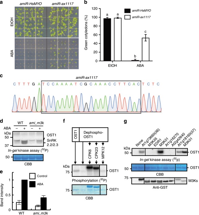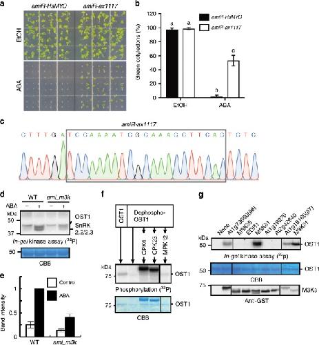 Fig. 1. Identification of MAPKK-kinases that reactivate OST1/SnRK2 kinases by phosphorylation.a Seeds of amiR-HsMYO wild-type (control line) or amiR-ax1117 mutant were sowed on 1/2 MS medium containing 2âμM ABA, or 0.02% EtOH as control, for germination assays. Representative images showing seed germination after 6 days. b The percentage of seedlings showing green cotyledons was analyzed. Data represent meanâ±âs.d. nâ=â4 experiments. Each experiment included 64 seeds for each genotype. Letters at the top of columns are grouped based on two-way ANOVA and Tukeyâs test, Pâ<â0.05. c Identification of the amiRNA sequence in amiR-ax1117 plants. Black box labels the sequence of amiR-ax1117. The amiR-ax1117 is predicted to include Raf-like protein kinase genes M3Kδ5, M3Kδ7, M3Kδ1, M3Kδ6, and M3Kδ-CTR1 kinase (see Supplementary Fig. 1). d Wild-type (WT) and m3k amiRNA seedlings were incubated with 10âµM ABA for 15âmin. In-gel kinase assays were performed using histone type III-S as a substrate. e SnRK2 band intensities as shown in d were measured using ImageJ, nâ=â3 experiments, error bars show ±s.e.m. f, Recombinant GST-OST1/SnRK2.6 protein was dephosphorylated by alkaline phosphatase in vitro and used for in vitro phosphorylation assays after incubation with CPK6, CPK23 or MPK12 protein kinases. Note visible autophosphorylation activity of CPK6 and CPK23. g Dephosphorylated recombinant His-OST1/SnRK2.6 protein was incubated with kinase domains of seven M3Ks and used for in-gel kinase assays (phylogenetic tree: see Supplementary Fig. 1). Note lanes on the left are from the same gel as lanes in the middle section. |