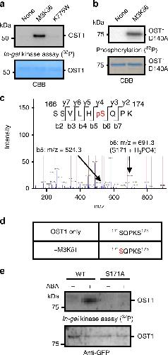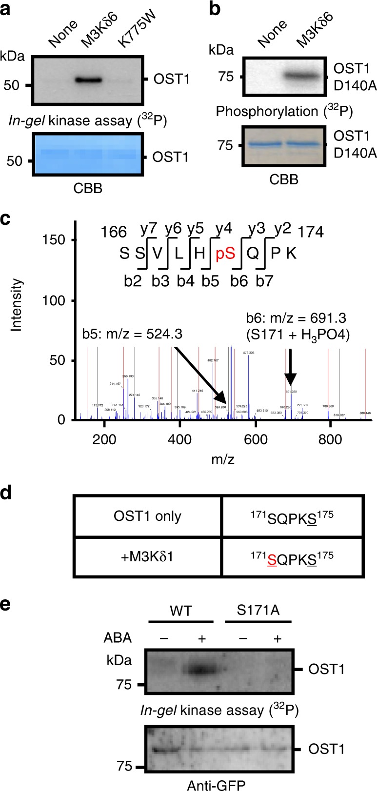 Fig. 2. MAPKK-kinase-induced OST1/SnRK2.6 Ser171 phosphorylation is essential for ABA activation of OST1/SnRK2.6 activation.a The inactive M3Kδ6 kinase domain mutant (K775W) did not reactivate His-OST1/SnRK2.6 in vitro. b Inactive GST-OST1/SnRK2.6-D140A kinase protein was incubated with M3Kδ6 kinase domain, and in vitro phosphorylation assays were performed with 32P-ATP. c Recombinant inactive OST1(D140A) and M3Kδ1 kinase domains were incubated with ATP. A mass spectrum of phosphorylated OST1 peptide (SSVLHpSQPK) is shown. pS indicates phosphorylated Ser171 of OST1(D140A). d Phosphorylation at Ser171 was not detectable after in vitro autophosphorylation of OST1/SnRK2.6, but was consistently phosphorylated in the presence of M3Kδ1. e OST1(S171A)-GFP was transiently expressed in Arabidopsis mesophyll cell protoplasts. Protoplasts were incubated with 10âµM ABA or control buffer for 15âmin, and OST1/SnRK2.6 activities were analyzed by in-gel kinase assays. |