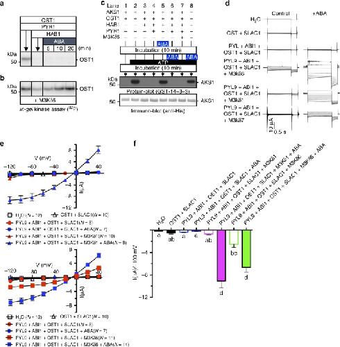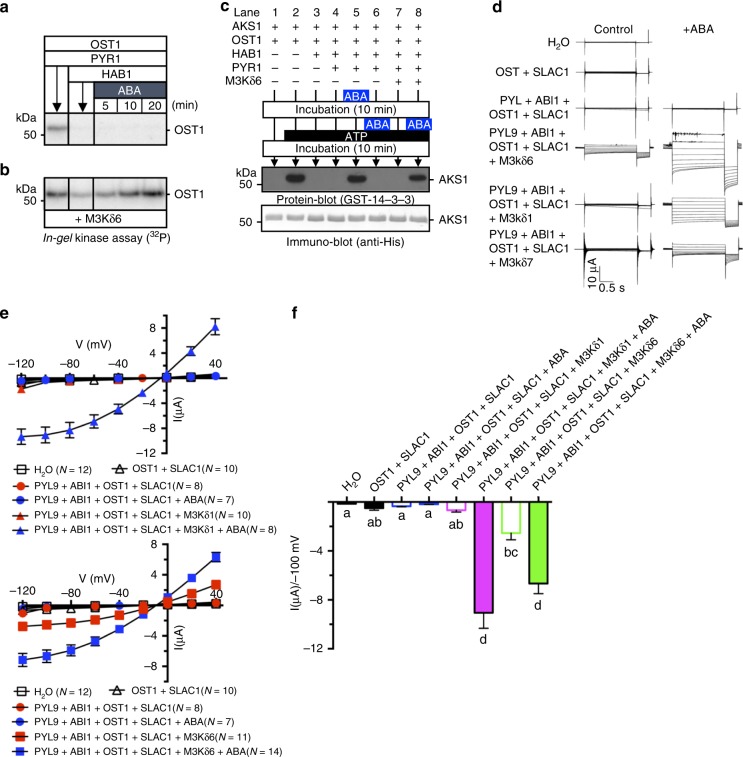 Fig. 4. MAPKK-kinases are essential for ABA signalling module.a, b In vitro reconstitution of ABA-induced OST1/SnRK2 activation without M3Kδ6 (a) or with M3Kδ6 (b). The recombinant proteins His-PYR1/RCAR11, His-OST1/SnRK2.6 without (a) or with (b) GST-M3Kδ6 kinase domain were mixed. After addition of His-HAB1, protein solutions were incubated for 10âmin. Then, 50âµM ABA was added to the protein solution. Reactions were stopped at the indicated times. OST1/SnRK2.6 kinase activities were detected by in-gel kinase assays. c Recombinant His-PYR1/RCAR11, His-HAB1, His-OST1/SnRK2.6, His-AKS1, and GST-M3Kδ6 kinase domain were mixed as indicated above the gel. 50âµM ABA was added before (lane 5) or after (lanes 6 and 8) 10âmin incubation at room temperature. Then, 100âµM ATP was added (lanes 2â8) to trigger phosphorylation reactions for 10âmin. Note that M3Kδ6 is required for ABA-induced AKS1 phosphorylation when ABA is added 10âmin after exposure to HAB1-PP2C-including mix (compare lanes 6 and 8). Reactions were stopped by addition of SDS-PAGE loading buffer. Phosphorylation of AKS1 is detected by binding of 14-3-3Phi (At1g35160) to the phosphorylated AKS1 protein15. AKS1 phosphorylation is shown by protein-blot (top), and protein amount is monitored by immuno-blot (bottom). dâf Reconstitution of ABA-activation of SLAC1 channels in Xenopus oocytes, in the presence or absence of M3Ks. d Representative whole-cell chloride current recordings of oocytes co-expressing the indicated proteins, without (control) or with injection of 50âμM ABA (+ABA). Currents were recorded in response to voltage pulses ranging from +40âmV to â120âmV in â20 mV steps with a holding potential at 0âmV and a final tail potential of â120âmV. e Mean current-voltage curves of oocytes co-expressing the indicated proteins, with or without injection of ABA. The symbols of H2O control, OST1â+âSLAC1, PYL9/RCAR1â+âABI1â+âOST1â+âSLAC1, PYL9/RCAR1â+âABI1â+âOST1â+âSLAC1â+âABA, and PYL9/RCAR1â+âABI1â+âOST1â+âSLAC1â+âM3Ks overlapped. Single symbols are shown for some data points for better viewing. f Average SLAC1-mediated currents at â100âmV, co-expressing the indicated proteins, in the presence or absence of 50âμM ABA. Data from three independent batches of oocytes showed similar results. One representative batch of oocytes is shown, with the number of oocytes in that batch indicated in parentheses. H2O, OST1â+âSLAC1, PYL9/RCAR1â+âABI1â+âOST1â+âSLAC1, and PYL9/RCAR1â+âABI1â+âOST1â+âSLAC1â+âABA controls are the same data in both panels in e as the data are from the same oocyte batch. Error bars denote meanâ±âs.e.m. Means with letters (a, b, c, and d) are grouped based on one-way ANOVA and Tukeyâs multiple comparisons test, Pâ<â0.05. |
