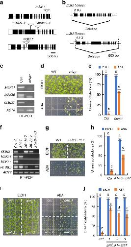 Fig. 5. MAPKK-kinases are required for plant ABA response.a Genome structures and T-DNA insertion sites of M3K genes are shown. b Genomic regions of CRISPR/Cas9-mediated M3Kδ1 and M3Kδ7 gene deletions are shown. These deletions were introduced in the m3kδ6-2 T-DNA knockout mutant as a background. c RT-PCR assays show transcripts of kinase domains of M3Ks in the m3kδ1crispr m3kδ6-2 m3kδ7crispr triple mutant. d m3kδ1crispr m3kδ6-2 m3kδ7crispr triple mutant seedlings were grown on 1/2 MS plates supplemented with 2 µM ABA or ethanol (control) for 16 days. e Seedlings showing green cotyledons as in d were counted. n = 3 (EtOH) and n = 4 (ABA) experiments, means ± s.d., 45 seeds per genotype were used in each experiment. f RT-PCR shows M3Kδ1, δ6, and δ7 expression in the indicated m3k T-DNA insertion mutants. δ6(KD) refers to primers that amplify the M3Kδ6 kinase domain in the m3kδ6-1 T-DNA line. g m3kδ1 m3kδ6-1 m3kδ7 T-DNA triple mutant plants were grown on 1/2MS plates supplemented with 0.8 µM ABA for 9 days. h Seedlings showing green cotyledons as in g were counted. n = 3, means ± s.d., 60–88 seeds were used per genotype in each assay. i Three amiRNA lines targeting M3Kδ1, δ6, and δ7 were grown on 1/2MS plates supplemented with EtOH (control) or 2 µM ABA for 9 days. As a control line, the amiRNA-HsMYO line21 was used. j Seedlings showing green cotyledons as in i were counted. n = 3 (EtOH) and 4 (ABA) experiments, means ± s.d., 81 seeds per genotype were analyzed in each experiment. (e, h, and i) Letters at the top of columns are grouped based on two-way ANOVA and Tukey’s test, P < 0.05. |