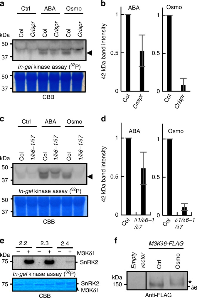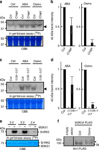 Fig. 6. MAPKK-kinases mediate ABA- and osmotic stress-induced SnRK2 activation in planta.a m3kδ1crispr m3kδ6-2 m3kδ7crispr triple mutant seedlings were incubated in 10 µM ABA or 0.3 M mannitol (Osmo) for 15 min. SnRK2 activities were tested by in-gel kinase assays. Arrowhead shows SnRK2 activity23. b Normalized band intensities as shown in a were measured by using ImageJ. n = 4, means ± s.e.m. c m3kδ1 m3kδ6-1 m3kδ7 T-DNA triple mutant seedlings were incubated in 10 µM ABA or 0.3 M mannitol (Osmo) for 15 min. SnRK2 activities were analyzed by in-gel kinase assays. d Normalized band intensities as shown in c were measured by using ImageJ. n = 4 experiments, means ± s.e.m. e, Recombinant GST-tagged Arabidopsis SnRK2 protein kinases were incubated with M3Kδ1 kinase domain. SnRK2 kinase activities were analyzed by in-gel kinase assays. f M3Kδ6-FLAG was transiently expressed in Arabidopsis mesophyll cell protoplasts. Protoplasts were incubated in 0.8 M mannitol (Osmo) for 15 min. M3Kδ6 proteins were detected by immuno-blot using anti-FLAG antibody. In the Osmo lane, the M3Kδ6 band showed a slight mobility shift as indicated by an asterisk. |