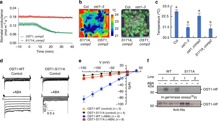 Fig. 3. OST1/SnRK2.6 Ser171 is essential for ABA-induced stomatal closure and S-type anion channel activation in planta.a Stomatal conductances were analyzed in intact detached leaves of stable transgenic Arabidopsis [pUBQ10:OST1-HF/ost1-3 (OST1-comp2) and pUBQ10:OST1-S171A-HF/ost1-3 (S171A-comp2)]. 2âμM ABA was applied to petioles at 0âmin. Data presented are meansâ±âs.e.m. (nâ=â4 leaves from four plants for each genotype). b Leaf temperatures of Col, ost1-3, OST1-comp2 and S171A-comp2 were measured by thermal imaging. Plants were sprayed with 20âµM ABA, and thermal images were taken after 3âh. The bright field image shows where leaves from neighboring plants overlapped. c, Leaf temperatures were measured by using Fiji software (nâ=â5 experiments, meansâ±âs.e.m.). Letters at the top of columns are grouped based on one-way ANOVA and Tukeyâs test, Pâ<â0.05. d ABA-activated S-type anion channel currents were investigated by patch-clamp analyses using guard cell protoplasts from the transgenic Arabidopsis lines pUBQ10:OST1-HF/ost1-3 (OST1-WT) and pUBQ10:OST1-S171A-HF/ost1-3 (OST1-S171A). e Average current-voltage relationship of S-type anion channel as shown in d. Data presented are meansâ±âs.e.m. f Kinase activities of OST1(S171A) in mesophyll cells from stably-transformed homozygous transgenic plants were investigated by in-gel kinase assays. Protoplasts were incubated with 10âµM ABA for 15âmin. |