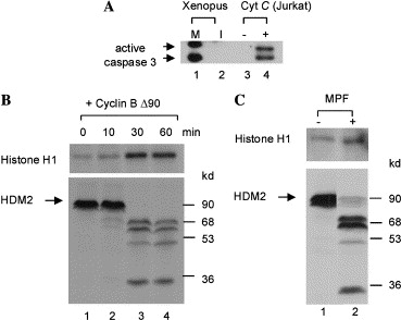 Progression of the cell cycle and control of apoptosis are tightly linked processes. It has been reported that manifestation of apoptosis requires cdc2 kinase activity yet the mechanism(s) of which is largely unclear. In an attempt to study the role of human MDM2 (HDM2) in interphase and mitosis, we employed the Xenopus cell-free system to study HDM2 protein stability. Interestingly, HDM2 is specifically cleaved in Xenopus mitotic extracts but not in the interphase extracts. We demonstrate that HDM2 cleavage is dependent on caspase-3 and that activation of cdc2 kinase results in caspase-3 activation in the Xenopus cell-free system. Furthermore, expression of cdc2 kinase in mammalian cells leads to activation of caspase-3 and apoptosis. Taken together, these data indicate that deregulation of cdc2 kinase activity can trigger apoptotic machinery that leads to caspase-3 activation and apoptosis.