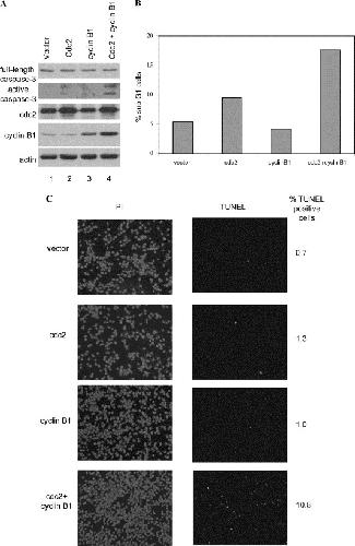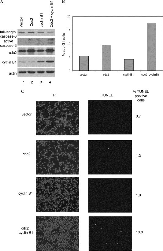 Overexpression of cdc2/cyclin B1 in HeLa cells results in caspase-3 activation and apoptosis. HeLa cells were either transfected with vector, cdc2, and cyclin B1 alone, or co-transfected with cdc2 and cyclin B1. Twenty-four hours after transfection, cells were collected. (A) Forty μg of total protein extracts was separated on 10% SDS–PAGE and subjected to Western blot analysis using the antibody specific for full-length caspase-3, activated caspase-3, cdc2, cyclin B1, and actin. (B) Cells (1×105) were subjected to FACS analysis and percentage of sub-G1 cells was analyzed by Cell Quest program. Data shown are representative from two independent experiments. (C) Cells (1×105) were cytospun onto glass slide. TdT-mediated dUTP nick end labeling (TUNEL) assay was performed to detect apoptotic cells. PI-stained cells (red) and TUNEL-positive cells (green) were photographed.