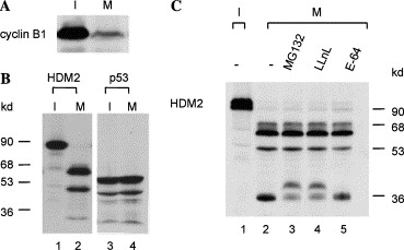 Specific cleavage of HDM2 protein in Xenopus mitotic extract. (A) 1 μl of in vitro translated Full-size image (<1 K)-labeled cyclin B1 was mixed with 10 μl of Xenopus interphase (I) or mitotic (M) extract and incubated at room temperature for 30 min. Five μl of the reaction products was separated on 10% SDS–PAGE. Full-size image (<1 K)-labeled products were detected by autoradiography. (B) One μl of in vitro translated Full-size image (<1 K)-labeled HDM2 (lanes 1 and 2) or p53 (lanes 3 and 4) was mixed with 10 μl of Xenopus interphase (I) or mitotic (M) extract and incubated at room temperature for 30 min. Five μl of the reaction products was separated on 10% SDS–PAGE. Full-size image (<1 K)-labeled HDM2, p53, and the degradation products were detected by autoradiography. (C) One μl of in vitro translated, Full-size image (<1 K)-labeled HDM2 was mixed with 10 μl of Xenopus interphase (I) or mitotic (M) extracts in the presence or absence of proteosome inhibitors MG132 (1.25 mM), ALLN (1.25 mM), or cysteine protease inhibitor E64 (1.25 mM) at room temperature for 30 min. Five μl of the reaction products was separated on 10% SDS–PAGE. Full-size image (<1 K)-labeled products were detected by autoradiography.