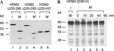 HDM2 is cleaved at D361, a caspase cleavage site. One μl of an in vitro translated, Full-size image (<1 K)-labeled HDM2 deletion mutant (A) or the caspase cleavage site mutant HDM2 (D361A) (B) was incubated with 10 μl of Xenopus interphase (I) or mitotic (M) extract at room temperature for 30 min (A) or for an indicated time (B). Five μl of the reaction products was separated on 10% SDS–PAGE. Full-size image (<1 K)-labeled products were detected by autoradiography.