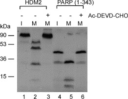 Activation of caspase-3 in Xenopus mitotic extract. One μl of in vitro translated, Full-size image (<1 K)-labeled HDM2 or N-terminal portion of PARP was mixed with 10 μl of Xenopus interphase (I) or mitotic (M) extract in the absence or presence of caspase-3 inhibitor Ac-DEVD-CHO (100 μM) as indicated. The mixture was incubated at room temperature for 30 min. Five μl of the reaction products was separated on 12% SDS–PAGE. Full-size image (<1 K)-labeled products were detected by autoradiography.