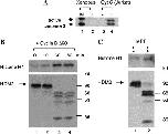 Correlation of activation of histone H1 kinase activity and HDM2 cleavage in mitotic extract. (A) Five μl of Xenopus interphase (lane 2) or mitotic (lane 1) extract, 10 μl (∼1.5×106 cells) of Cytochrome C-treated (lane 4) or—untreated (lane 3) Jurkat cell extract (Cell Signaling Technology) was mixed with equal volume of 2× Laemmli’s sample buffer, boiled for 3 min, and separated on 10% SDS–PAGE. Protein expression was detected by Western blot analysis using an antibody specific for active caspase-3 (Cell Signaling Technology). (B) Non-degradable sea urchin cyclin B Δ90 protein (1 mg/ml) was mixed (at the ratio of 1:25) with Xenopus interphase extract containing 1 μl of in vitro translated, Full-size image (<1 K)-labeled HDM2. The mixture was incubated for 0, 10, 30, and 60 min at room temperature. Five μl of products was separated on 10% SDS–PAGE. Full-size image (<1 K)-labeled products were detected by autoradiography. Kinase assay was performed using histone H1 as the substrate and the Full-size image (<1 K)-labeled histone H1 was detected by autoradiography. (C) Ten μl of Xenopus interphase extracts containing 1 μl of using in vitro translated, Full-size image (<1 K)-labeled HDM2 protein was treated with 10 U of recombinant Xenopus MPF at room temperature for 30 min. Treated (lane 2) or non-treated (lane 1) extracts were subjected to cdc2 kinase assay using histone H1 as the substrate and Full-size image (<1 K)-labeled HDM2 products were detected by autoradiography.