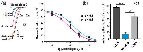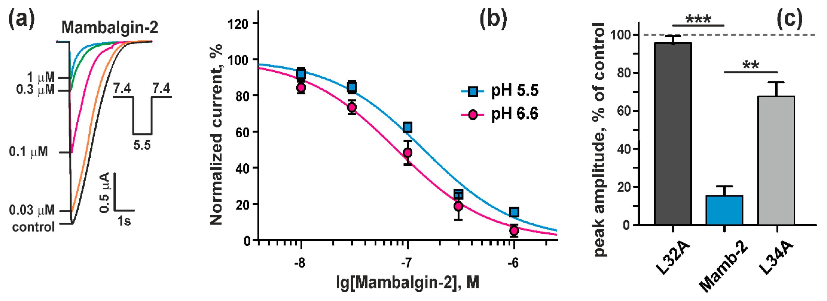 Figure 2. Effect of recombinant mambalgin-2 on rat ASIC1a expressed in Xenopus laevis oocytes: (a) Representative responses recorded in absence of mambalgin-2 (control) or presence of different mambalgin-2 concentrations, induced by buffer pH change from 7.4 to 5.5; (b) Doseâresponse inhibitory curves for mambalgin-2 at rat ASIC1a were fitted using Hill equation with IC50 142 ± 12 nM and 79 ± 9 nM for pH 5.5 stimulus (n = 6) and pH 6.6 stimulus (n = 8), respectively. The Hill coefficient was assumed equal to 1.0. Data are presented as % of control (without mambalgin-2) ± SEM; (c) Comparison of the peak amplitude of the transient currents at ASIC1a at pH 5.5 in presence of 1 μM mambalgin-2 and its variants with L32A and L34A substitutions. Data are presented as normalized peak current amplitude, % of control ± SEM (n = 6). Control level (100%) is shown by dashed line. ** (p < 0.01) and *** (p < 0.0001) indicate significant difference between data groups according to One-way ANOVA followed by Dunnettâs test. |
