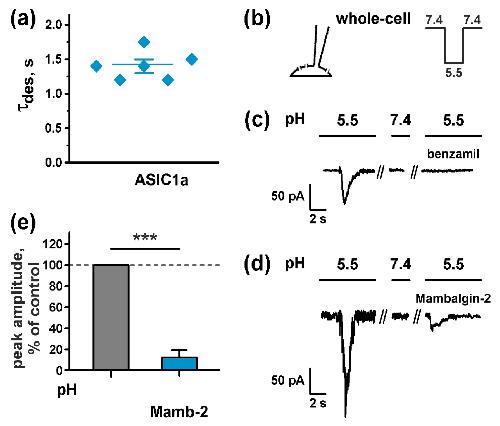 Figure 3. Mambalgin-2 effect on ASIC1a expressed in U251 MG glioma cells: (a) Desensitization time constant Ïdes of ASIC1a. Data are presented as mean ± SEM (n = 6); (b) Whole-cell configuration of the patch clamp technique and protocol of experiment; (c) Activation of the ASIC1a currents in U251 MG cells caused by rapid change of the extracellular solution pH from 7.4 to 5.5 (control, on the left), in the solution with pH 7.4 (in the middle), and upon application of 10 µM benzamil to the extracellular solution with pH 5.5 (on the right); (d) Activation of the ASIC1a currents in U251 MG cells caused by rapid change of the extracellular solution pH from 7.4 to 5.5 (control, on the left), in the solution with pH 7.4 (in the middle), and upon application of 1.5 µM mambalgin-2 to the extracellular solution with pH 5.5 (on the right); (e) Influence of 1.5 µM mambalgin-2 application to the extracellular solution with pH 5.5 on the peak amplitude of the ASIC1a currents in U251 MG cells. Data are presented as normalized peak current amplitude, % of control ± SEM (n = 3). Control level (100%, untreated cells) is shown by dashed line. *** (p < 0.001) indicates significant difference from the control according to two-sided t-test. |