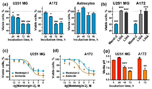 Figure 4. Mambalgin-2 influence on growth of U251 MG and A172 glioma cells and normal astrocytes: (a) 1 µM mambalgin-2 effect on U251 MG, A172 cells and astrocytes proliferation during different incubation times. Data are presented as % of control (untreated cells, dashed line) ± SEM (n = 4). # (p < 0.05), ## (p < 0.01), and ### (p < 0.001) indicate significant difference from the control according to One-way ANOVA followed by Dunnett’s test; (b) Influence of 1 μM mambalgin-2 and its Leu32Ala and Leu34Ala mutants on proliferation of U251 MG and A172 cells during 72-h incubation. Data are presented as % of control (untreated cells, dashed line) ± SEM (n = 4). ### (p < 0.001) indicates significant difference from the control according to One-way ANOVA followed Dunnett’s hoc test. *** (p < 0.001) indicates significant difference in activity of mutants and mambalgin-2 according to One-way ANOVA followed by Dunnett’s test; (c,d) effect of different mambalgin-2 and amiloride concentrations on U251 MG (c) and A172 (d) cell growth during 72-h incubation. The parameters describing concentration-effect curves (EC50, A0) are given in the Table 1. Data are presented as % of control (untreated cells) ± SEM (n = 3–11); (e) analysis of the pH value of culture medium during prolonged cultivation of U251 MG and A172 cells (n = 4). ** (p < 0.01) and *** (p < 0.001) indicate significant difference from the pH value of the culture media in an initial time point according two-tailed t-test. |