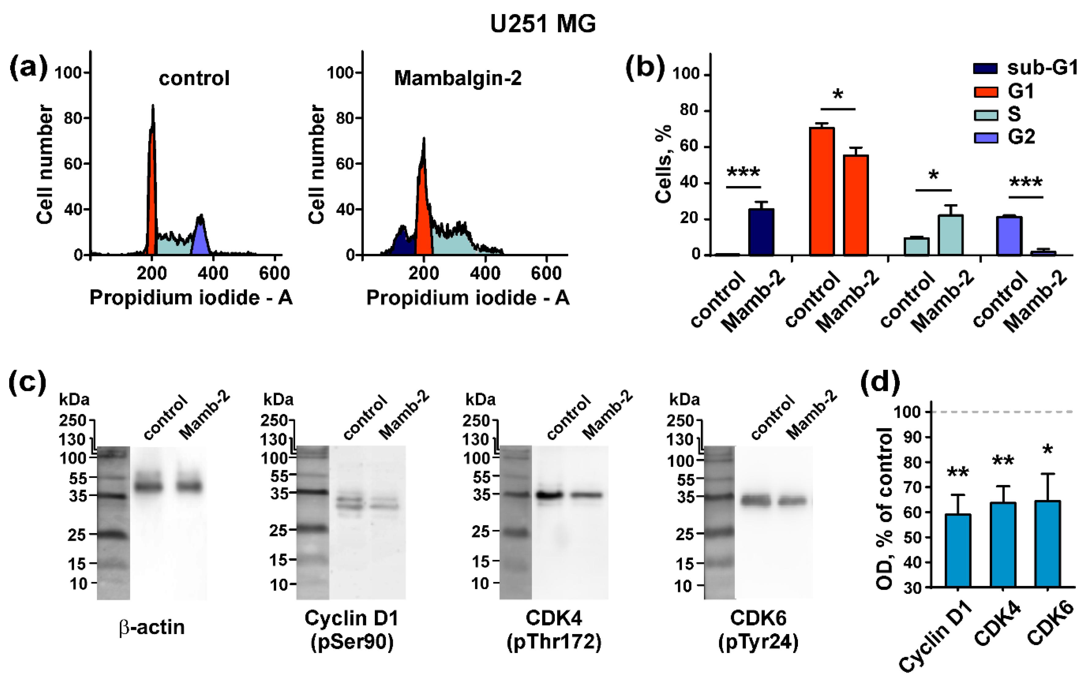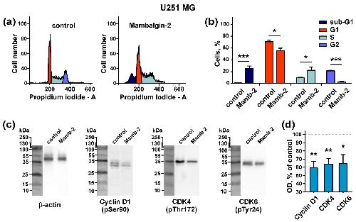 Figure 5. Mambalgin-2 influence on the cell cycle and activity of cell cycle regulators in U251 MG cells: (a) Representative nuclei population distributions of cells after 72-h incubation in absence (control) or presence of 1 µM mambalgin-2; (b) % of cells in each cell cycle phase determined by ModFitLT Software. Data are presented as % of cells in each cell cycle phase ± SEM, n = 4; * (p < 0.05) and *** (p < 0.001) indicate the significant difference from the control by two-tailed t-test; (c) Representative Western blots, showing the mambalgin-2 influence on phosphorylation of Cyclin D1 (pSer90), cyclin-dependent kinases (CDK)4 (pThr172), and CDK6 (pTyr24); (d) The optical density (OD) of blot bands for comparison of the Cyclin D1 (pSer90), CDK4 (pThr172), CDK6 (pTyr24) expression upon 72-h incubation of cells in absence (control) or presence of 1 µM mambalgin-2. Data are presented as normalized to the β-actin band intensity, where untreated cells are taken as the control (100%, dashed line) ± SEM, n = 6; * (p < 0.05) and ** (p < 0.01) indicate the significant difference between control and mambalgin-2 treated cells by two-tailed t-test. |