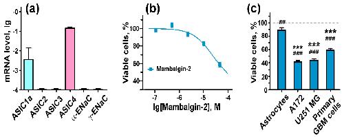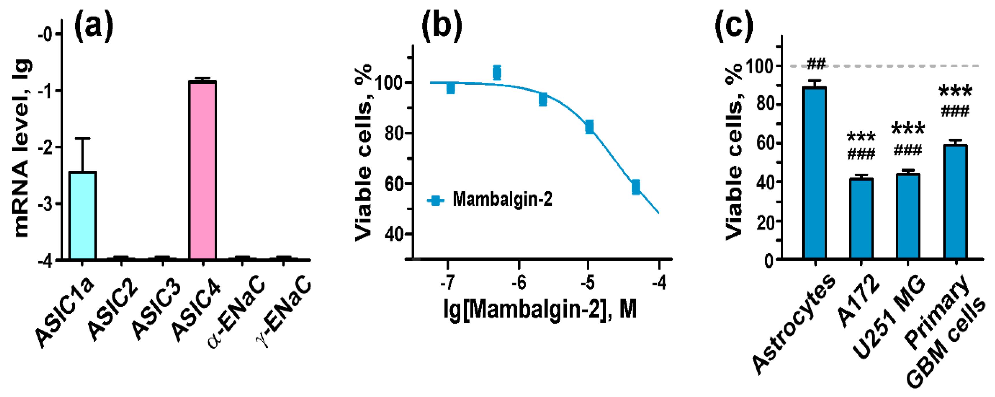 Figure 8. Mambalgin-2 effect on cells of primary culture obtained from a patient with glioblastoma (GBM). (a) Analysis of ASICs and ENaCs gene expression in primary GBM cells by qPCR. Gene expression was normalized to the β-ACTIN, GPDH and RPL13a housekeeping genes and presented as lg of relative mRNA level ± SEM (n = 3â5); (b) Influence of different mambalgin-2 concentrations on viability of primary GBM cells. Cells were incubated for five days with mambalgin-2 and their viability was accessed by Alamar Blue assay. Data are presented as % of control (untreated cells) ± SEM (n = 3); (c) Comparison of the 50 µM mambalgin-2 inhibitory effect on viability of normal astrocytes, U251 MG, A172, and primary GBM cells by Alamar Blue assay. Data are presented as % of control (untreated cells, dashed line) ± SEM (n = 3). ## (p < 0.01) and ### (p < 0.001) indicate significant difference between treated and untreated cells according to One-way ANOVA followed by Dunnettâs test. *** (p < 0.001) indicates significant difference of mambalgin-2 action on cells from the effect on astrocytes according to One-way ANOVA followed by Dunnettâs test. |
