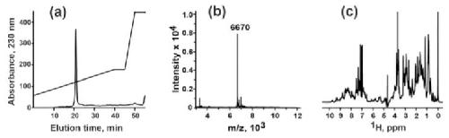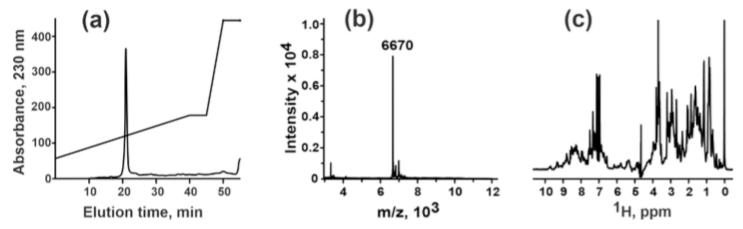 Figure S1. Characterization of the refolded mambalgin-2: (a) HPLC analysis of mambalgin-2 homogeneity and purity; (b) Mass-spectrometry analysis of mambalgin-2; (c) 1H-NMR spectra of mambalgin-2. |