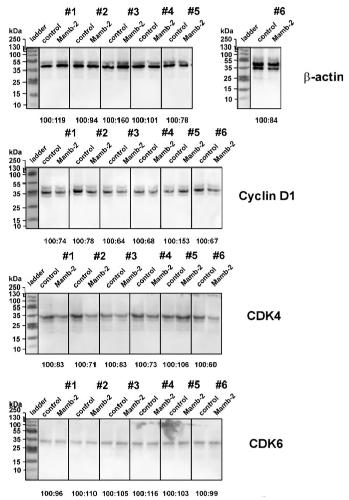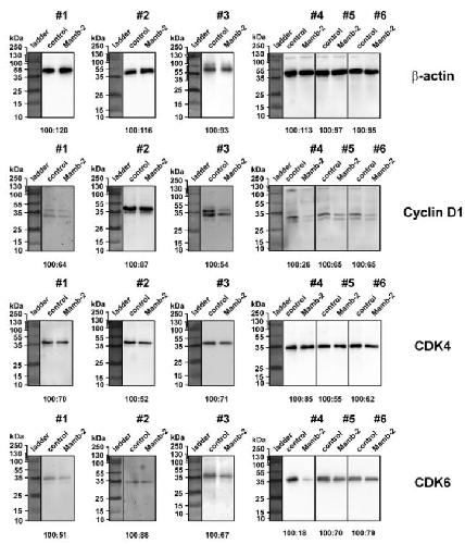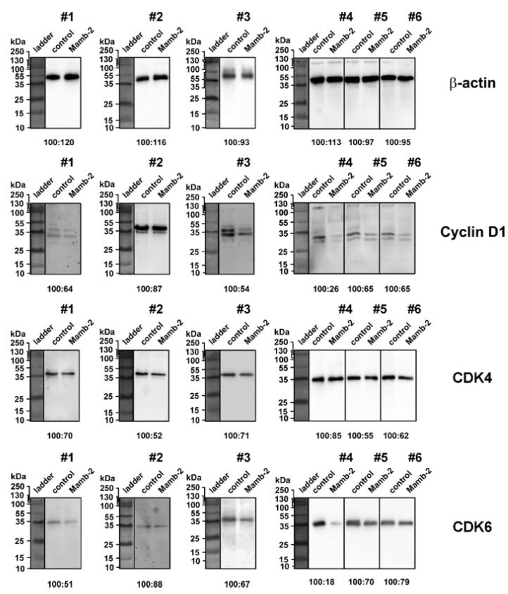 Figure S3. Western blots from 6 independent portions of A172 cells, showing the mambalgin-2 influence on phosphorylation of Cyclin D1 (pSer90), CDK4 (pThr172), and CDK6 (pTyr24) expression. Cells were incubated with 1 μM mambalgin-2 or 0,1% DMSO for 72 h (see methods) and protein phosphorylation/expression was analyzed by western blot. Cell portions of cells are shown as #1-#6 and were analyzed on the same membrane. Protein ladder (Thermo Fisher, 26619) from optical channel is shown on the left of each membrane. Optical density ratio of the protein bands corresponded to the untreated cells (control) and mambalgin-2 treated cells (Mamb-2) is presented below the lanes. |