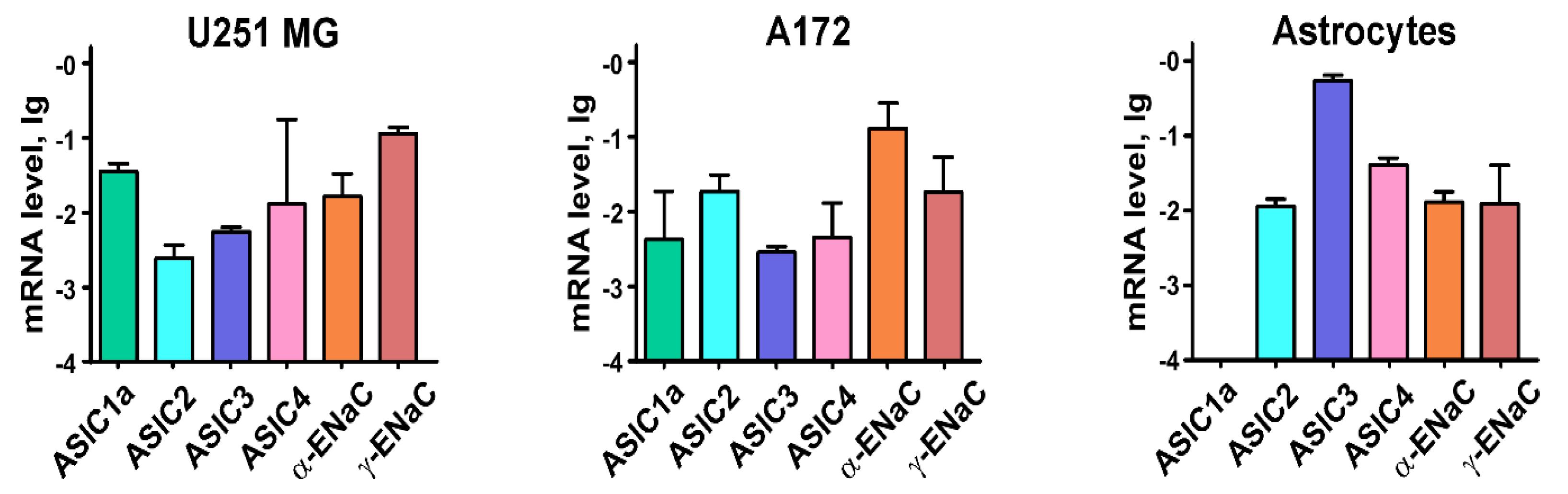 Figure 1. qPCR analysis of Acid-sensing Ion Channels (ASICs) and epithelial Na+ channels (ENaCs) mRNA expression in U251 MG and A172 cells and normal astrocytes. Gene expression was normalized to the β-ACTIN, GPDH and RPL13a housekeeping genes and presented as lg of relative mRNA level ± standard error of mean (SEM) (n = 3â5). |