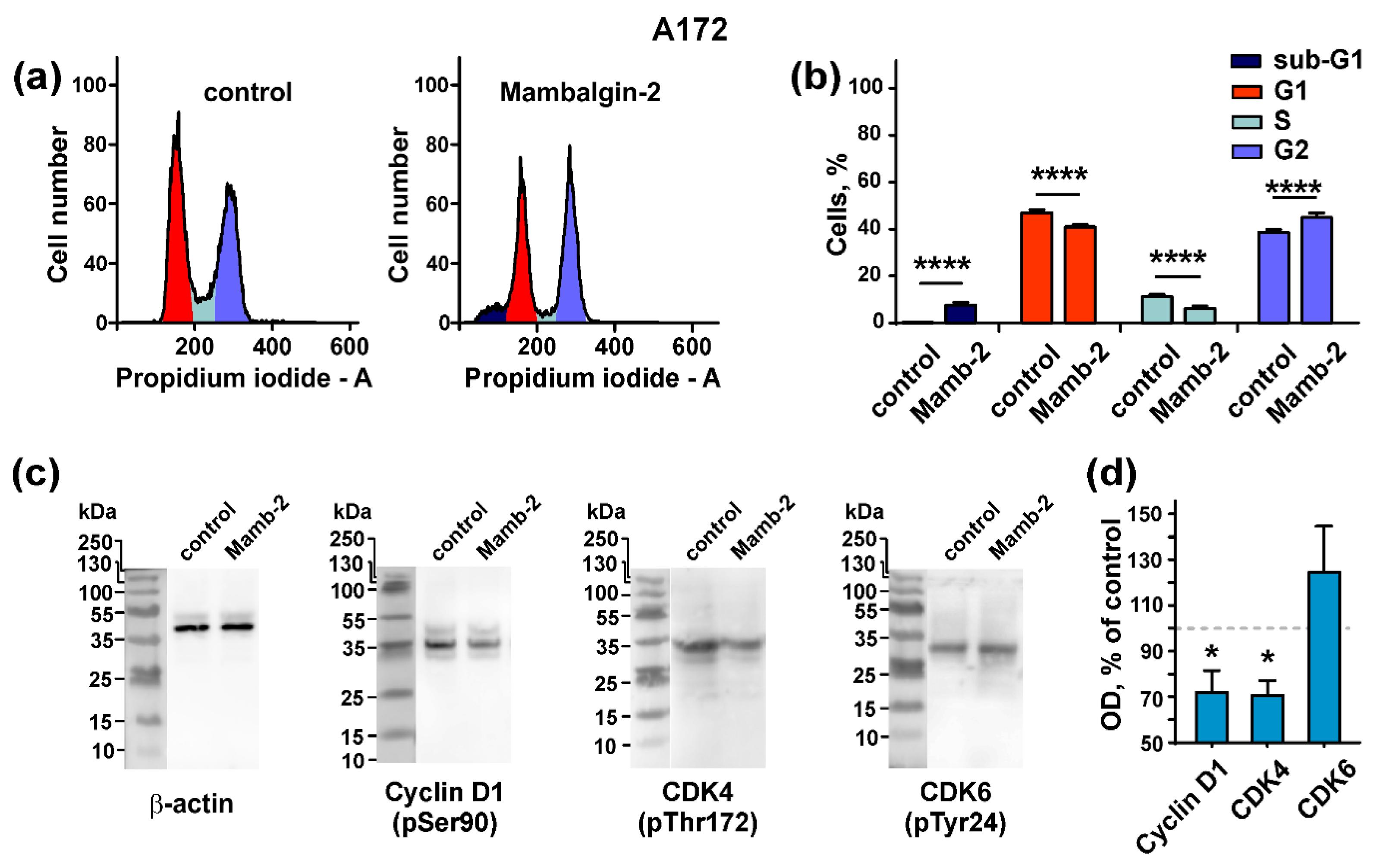 Figure 6. Mambalgin-2 influence on the cell cycle and activity of cell cycle regulators in A172 cells: (a) Representative nuclei population distributions of cells after 72-h incubation in absence (control) or presence of 1 µM mambalgin-2; (b) % of cells in each cell cycle phase determined by ModFitLT Software. Data are presented as % of cells in each cell cycle phase ± SEM, n = 4; **** (p < 0.0001) indicates the significant difference from the control by two-tailed t-test; (c) Representative Western blots, showing the mambalgin-2 influence on phosphorylation of Cyclin D1 (pSer90), CDK4 (pThr172), and CDK6 (pTyr24); (d) The optical density (OD) of blot bands for comparison of the Cyclin D1 (pSer90), CDK4 (pThr172), CDK6 (pTyr24) expression upon 72-h incubation of the cells in absence (control) or presence of 1 µM mambalgin-2. Data are presented as normalized to the β-actin band intensity, where untreated cells are taken as the control (100%, dashed line) ± SEM, n = 6; * (p < 0.05) indicates the significant difference between the control and mambalgin-2 treated cells by two-tailed t-test. |