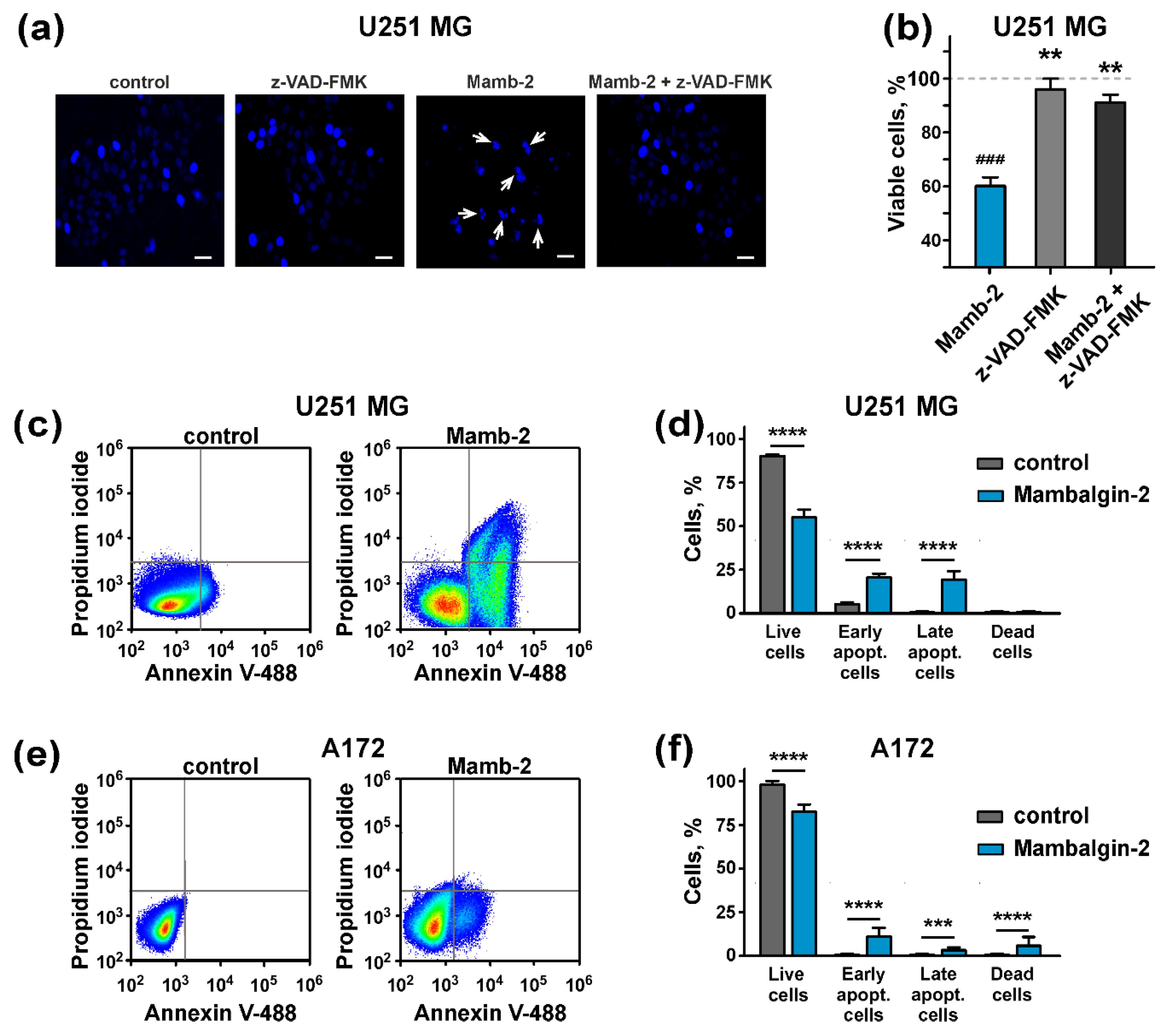 Figure 7. Apoptosis induction by mambalgin-2 in U251 MG and A172 cells: (a) Microscopic examination of nuclei morphology of U251 MG cells after their incubation with 1 µM mambalgin-2 in absence or presence of pan-caspase inhibitor z-VAD-FMK, scale bar = 10 µm; (b) Influence of mambalgin-2 and z-VAD-FMK on U251 MG cell proliferation. Data are presented as % of control (untreated cells, dashed line) ± SEM (n = 4). ### (p < 0.001) indicates significant difference between treated and untreated cells according to One-way ANOVA followed by Dunnett’s test. ** (p < 0.01) indicates significant difference from the mambalgin-2 treated cells according to One-way ANOVA followed by Dunnett’s test; (c,e) representative pictures of phosphatidylserine externalization analysis upon the mambalgin-2 treatment of U251 MG and A172 cells by flow cytometry with Annexin V-488 and Propidium iodide; (d,f) percentage of U251 MG and A172 cells with externalized phosphatidylserine and bound propidium iodide upon 72-h incubation in absence (control) or presence of 1 µM mambalgin-2. The data are presented as % of live, early apoptotic, late apoptotic and dead cells ± SEM (n = 4). *** (p < 0.001) and **** (p < 0.0001) indicate the significant difference of the groups from each other by a two-tailed t-test. |