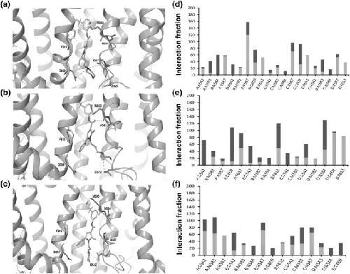 FIGURE 2. Predicted model of HC067047 interaction with mutant xTRPV4 systems. (a–c) Images corresponding to the last conformation of HC067047 on the binding pocket after 500‐ns MD in the xTRPV4‐D542A (a), xTRPV4‐Y587A (b) and xTRPV4‐Y587H (c) systems. (d–f) Interaction fraction plots depicting protein–HC067047 contacts during the course of 500‐ns MD simulation in the xTRPV4‐D542A (d), xTRPV4‐Y587A (e) and xTRPV4‐Y587H systems (f). Hydrophobic interactions, H bonds, ionic interactions and water bridges are shown in purple, green, fuchsia and blue, respectively. The stacked bar charts are normalized over the course of the trajectory: for example, a value of 0.7 suggests that 70% of the simulation time the specific interaction is maintained. Values over 1.0 are possible as some protein residue may make multiple contacts of same subtype with the ligand