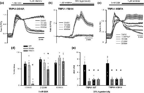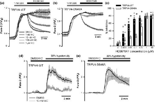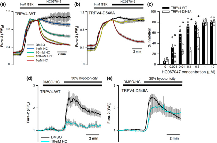 FIGURE 3. hTRPV4‐D546A mutation affects HC067047 inhibition. (a, b) Changes in intracellular [Ca2+] (indicated by normalized fura‐2 ratios) in HeLa cells transfected with hTRPV4‐WT (a) or hTRPV4‐D546A (b) cDNAs, after perfusion with 1‐nM GSK1016790A and addition of HC067047 (or vehicle) at the indicated concentrations at time t = 0. Traces are means ± SEM of 50 (DMSO), 71 (1 nM), 91 (10 nM), 95 (100 nM), 98 (500 nM), 94 (1 μM) and 63 (10 μM) cells expressing TRPV4‐WT and 59 (DMSO), 66 (1 nM), 93 (10 nM), 96 (100 nM), 44 (500 nM), 82 (1 μM) and 47 (10 μM) cells expressing TRPV4‐D546A. (c) Percentage inhibition of GSK1016790A‐induced increases in intracellular Ca2+ at different HC067047 concentrations. Mean ± SEM of 5 (DMSO), 6 (1 nM), 7 (10 nM), 7 (100 nM), 5 (500 nM), 7 (1 μM) and 5 (10 μM) independent experiments with TRPV4 and 6 (DMSO), 6 (1 nM), 6 (10 nM), 5 (100 nM), 5 (500 nM), 6 (1 μM) and 5 (10 μM) independent experiments with TRPV4‐D546A. (d, e) Changes in intracellular [Ca2+] in HeLa cells transfected with hTRPV4‐WT (d) or hTRPV4‐D546A (e) cDNAs, after perfusion with a 30% hypotonic solution in the presence (WT, n = 60; D546A, n = 75) or absence (WT, n = 69; D546A, n = 78) of 10‐nM HC067047