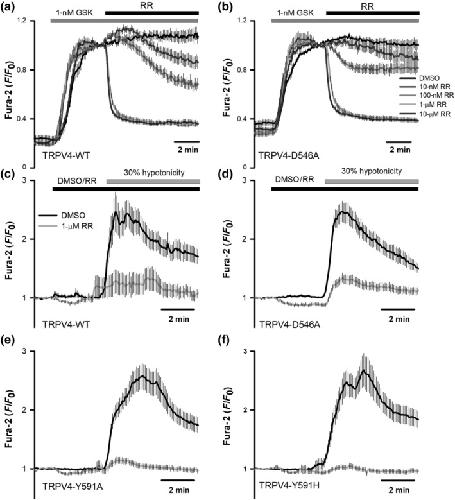 FIGURE 6. Mutations in hTRPV4 residues D546 and Y591 do not affect channel inhibition by ruthenium red. (a, b) Changes in intracellular [Ca2+] in HeLa cells transfected with hTRPV4‐WT (a) or hTRPV4‐D546A (b) cDNAs, after perfusion with 1‐nM GSK1016790A and addition of ruthenium red (or vehicle) at the indicated concentrations at time t = 0. Traces are means ± SEM of 48 (DMSO), 75 (10 nM), 67 (100 nM), 95 (1 μM) and 70 (10 μM) cells expressing TRPV4‐WT and 72 (DMSO), 53 (10 nM), 63 (100 nM), 73 (1 μM) and 80 (10 μM) cells expressing TRPV4‐D546A. (c–f) Changes in intracellular [Ca2+] in HeLa cells transfected with hTRPV4‐WT (c), D546A (d), Y591A (e), or Y591H (f) cDNAs, after perfusion with a 30% hypotonic solution in the presence or absence of 1‐μM ruthenium red (RR). N values for DMSO in WT, D546A, Y591A and Y591H are 23, 31, 27 and 35, respectively. N values for RR in WT, D546A, Y591A and Y591H are 30, 33, 31 and 34, respectively. Statistical analysis of the effect of RR on wild‐type versus mutant TRPV4 channels activated by GSK1916790A or hypotonicity reported a P > 0.05 for all conditions tested in panels (a)–(f), except for the comparison of the values obtained with 100‐nM RR in the presence of GSK (panels a and b) which was 0.04