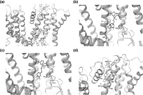 FIGURE 8. Interaction of new compounds with residues of the binding pocket. (a) Image corresponding to the last conformation of HC067047 (orange), 151066 (fuchsia), 212069 (blue) and 600684 (green) on the binding pocket of TRPV4 after 500‐ns MD. (b) Close up image of 151066 interactions. (c) Close up image of 212069 interactions. (d) Close up image of 600684 interactions. Hydrophobic interactions, H bonds and ionic interactions are shown in dashed lines in purple, fuchsia and green, respectively