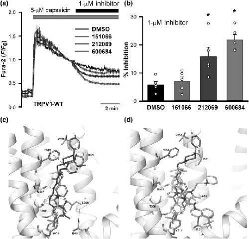 FIGURE 10. Interaction of new compounds with TRPV1. (a) Changes in intracellular [Ca2+] in HeLa cells transfected with hTRPV1 (DMSO, n = 40; 151066, n = 40; 212069, n = 43; 600684, n = 36 cells) after perfusion with 5‐μM capsaicin and addition of DMSO, or the indicated compounds at 1 μM. (b) Percentage inhibition of capsaicin‐induced increases in intracellular Ca2+ concentrations generated by TRPV1 (n = 5 for all conditions). (c) Image corresponding to the binding of capsaicin (yellow), 212069 (blue) and 600684 (green) on the binding capsaicin pocket of TRPV1. (d) Image similar to (c) with the addition of HC067047 (orange) and 151066 (fuchsia)