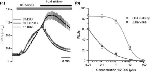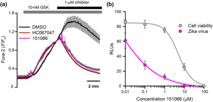 FIGURE 11. Inhibition of TRPV4 with 151066 reduces Zika virus infectivity. (a) Changes in cytosolic [Ca2+] measured in Huh7 cells after perfusion with 10‐nM GSK1016790A and addition of 1‐μM 151066 or HC067047. (b) Zika virus infection and cell viability in Huh7 cells treated with increasing concentrations of 151066. The data are presented as mean ± SEM of three independent experiments at each 151066 concentrations