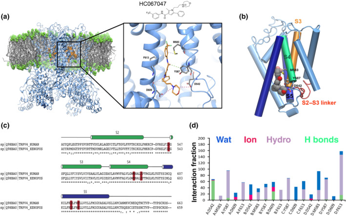 FIGURE 1. Predicted model of HC067047 interaction with TRPV4. (a) Location of HC067047 is shown on the tertiary structure of the Xenopus tropicalis TRPV4. The image corresponds the last conformation of HC067047 on the binding pocket after 500‐ns MD; right, a zoom‐in view of the HC067047 binding pocket. Residues important for interaction with HC067047 are coloured in grey. Hydrophobic interactions, H bonds and ionic interactions are shown as dashed lines in purple, green and fuchsia, respectively. (b) Interactions between HC067047 and residues D542, M583 and Y587 of a single subunit in the xTRPV4‐WT. (c) Sequence alignment of S2 to S5 from X. tropicalis and human TRPV4. Key residues within the HC067047 binding site marked in red. *Identical residues; conserved substitutions (same amino acid group); semi‐conserved substitution (similar shapes). (d) Interaction fraction plots depicting protein–HC067047 contacts during the course of 500‐ns MD simulation. Hydrophobic interactions, H bonds, ionic interactions and water bridges are shown in purple, green, fuchsia and blue, respectively. The stacked bar charts are normalized over the course of the trajectory, for example, a value of 0.7 suggests that 70% of the simulation time the specific interaction is maintained. Values over 1.0 are possible as protein residues may make multiple contacts of same subtype with the ligand